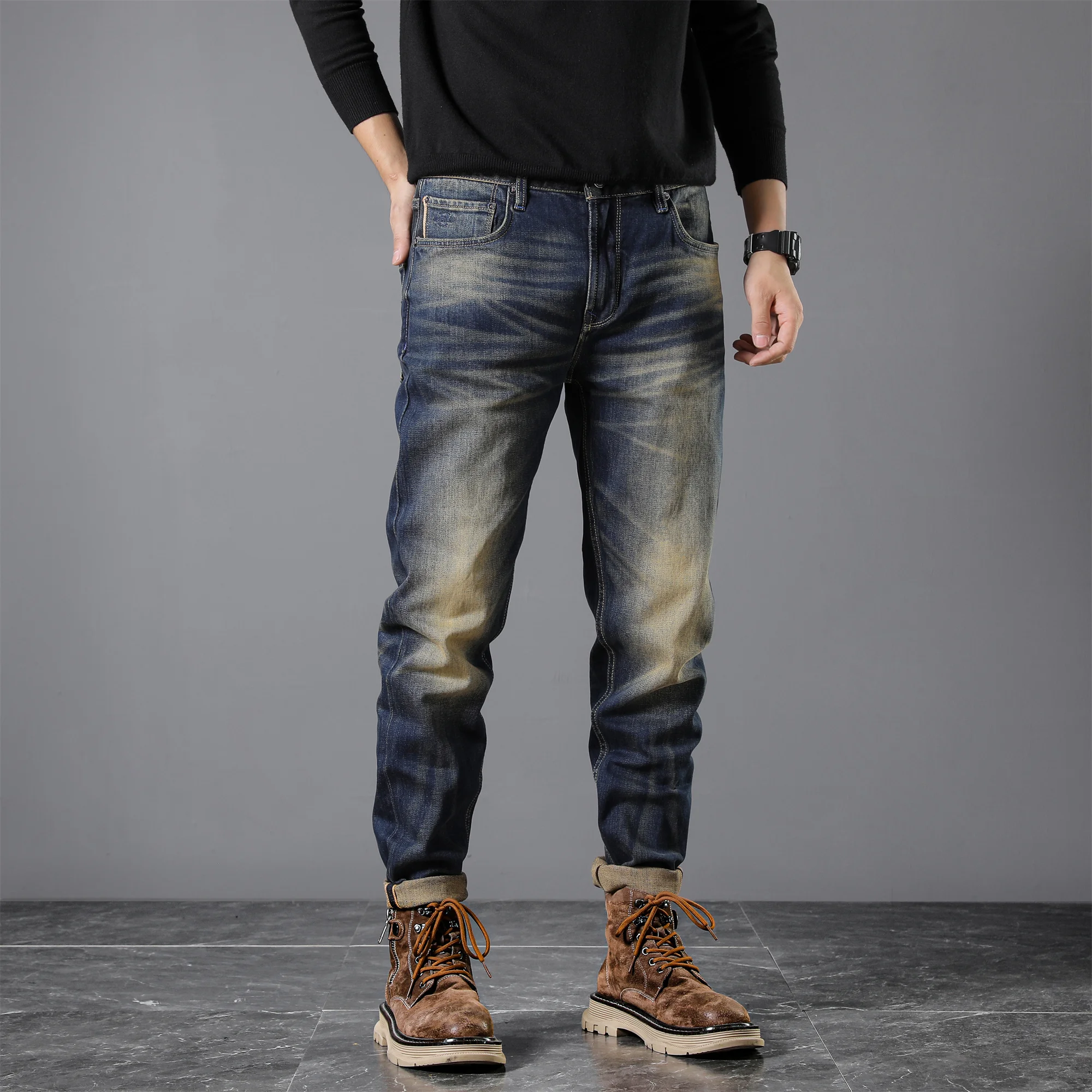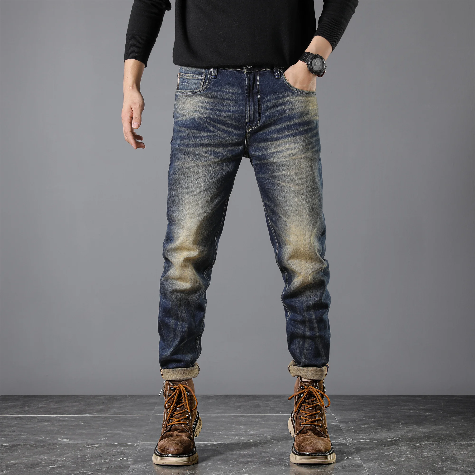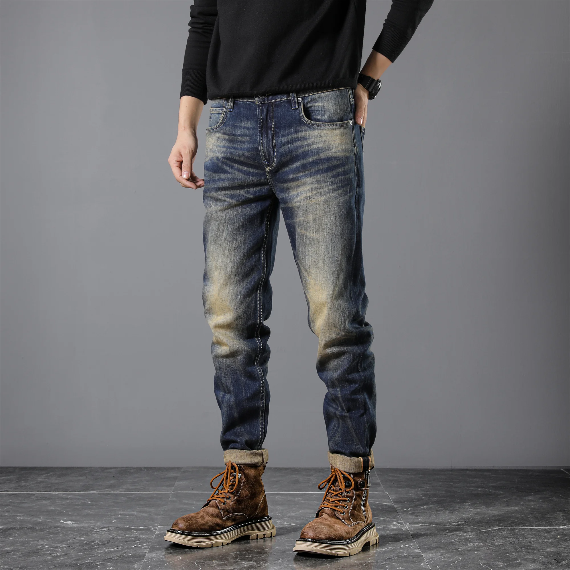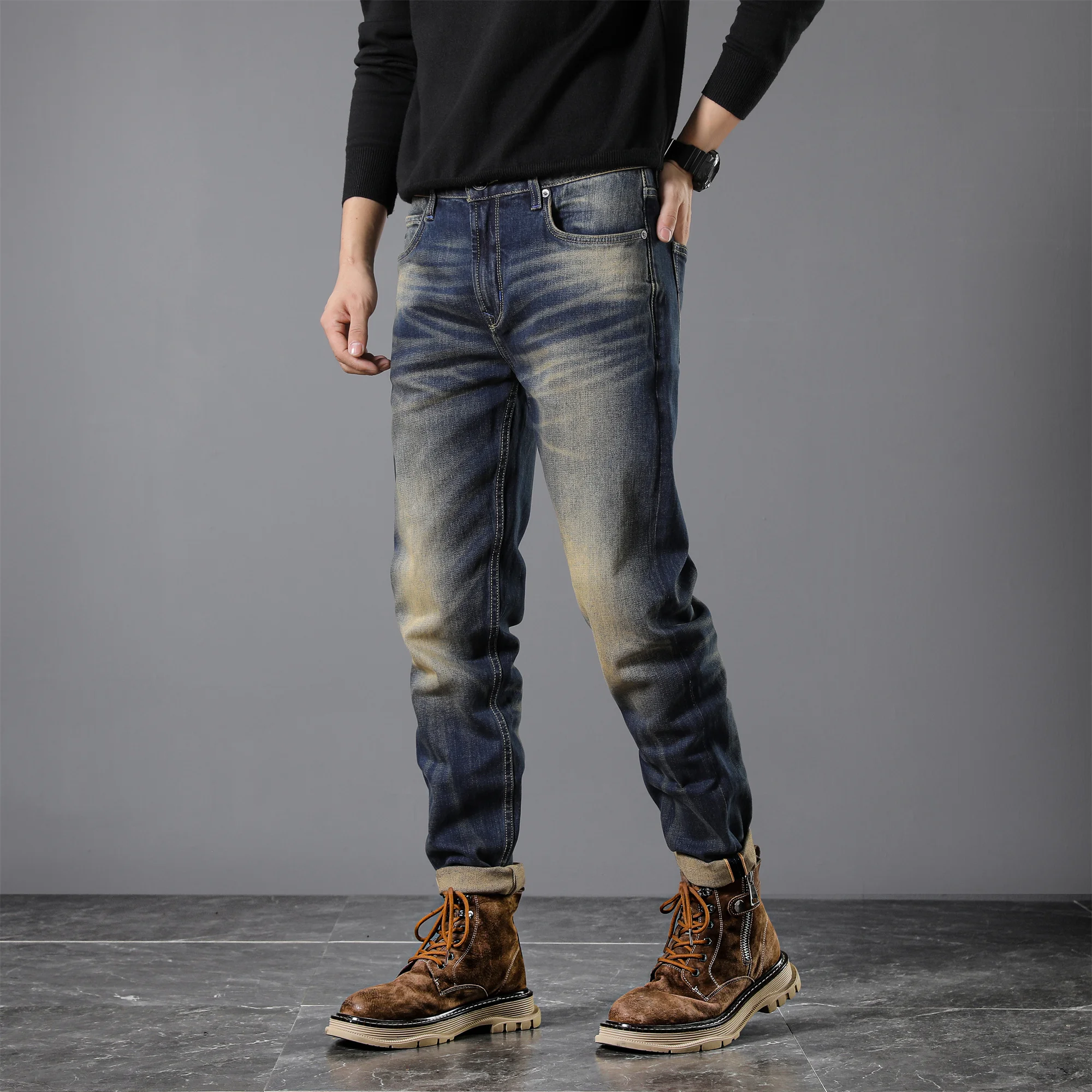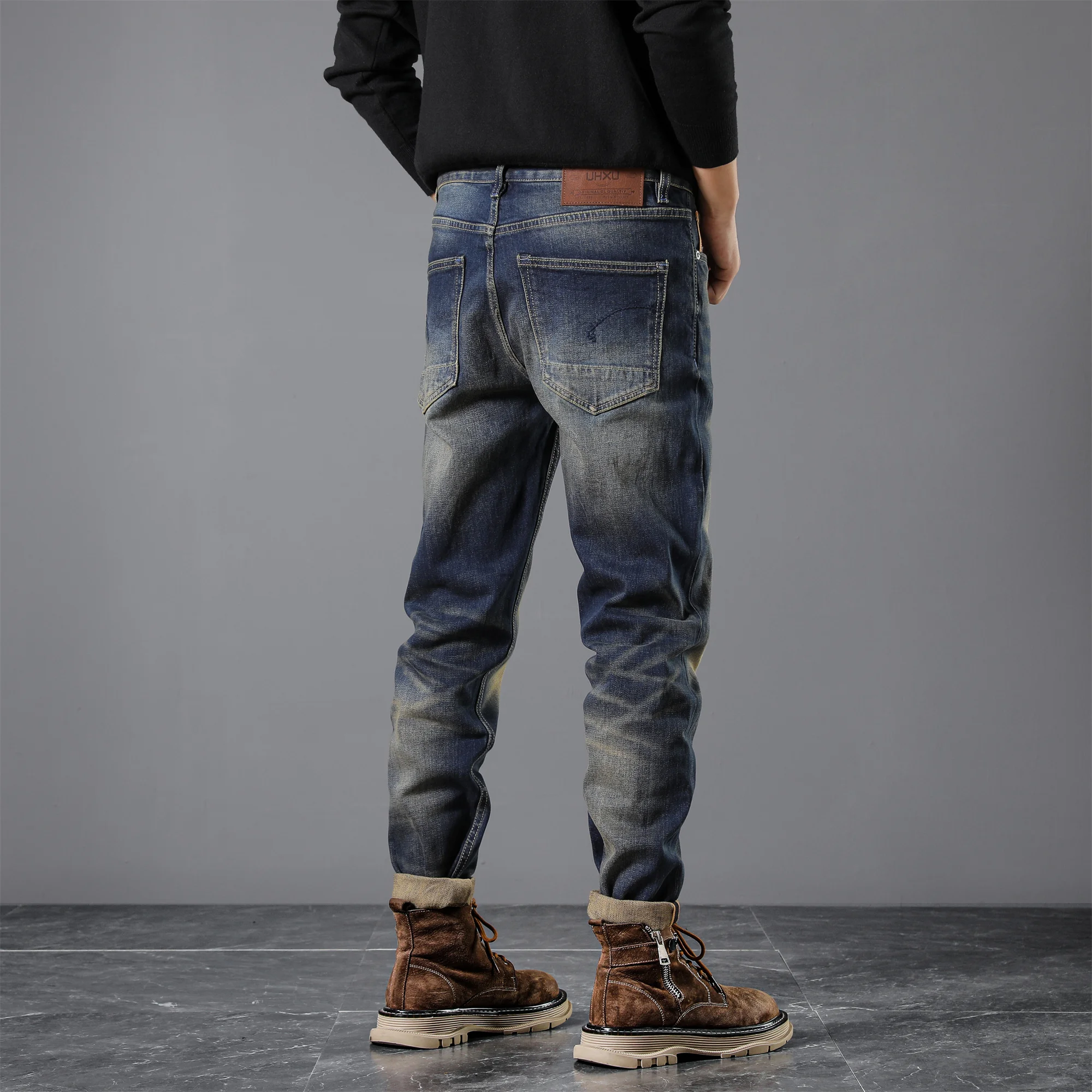 13.5oz 99% Cotton Red Selvedge Denim Men Jeans Retro Distressed Heavy Brushed Washed Straight Pants High Qaulity Casual Trousers